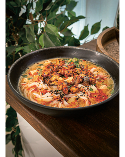 6/ Dans chaque bol ou assiette creuse, disposer 1 cuillerée à soupe de miso, 1 cuillerée à soupe de sauce tamari, 2 cuillerées à soupe de tahini et une demi-cuillerée à café de bouillon en poudre, puis diluer l’ensemble avec une première louche de dashi. Continuer de remplir avec le dashi, les légumes et les nouilles, puis déposer par-dessus un peu d’aubergines rôties ainsi que les toppings choisis. Déguster bien chaud !